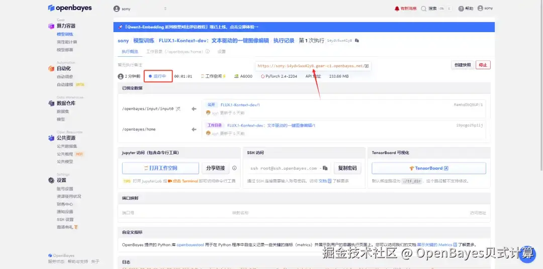 4.等待分配资源,首次克隆需等待 2 分钟左右的时间。当状态变为「运行中」后,点击「API 地址」旁边的跳转箭头,即可跳转至 Demo 页面。由于模型较大,需等待约 3 分钟显示 WebUI 界面,否则将显示「Bad Gateway」。请注意,用户需在实名认证后才能使用 API 地址访问功能。