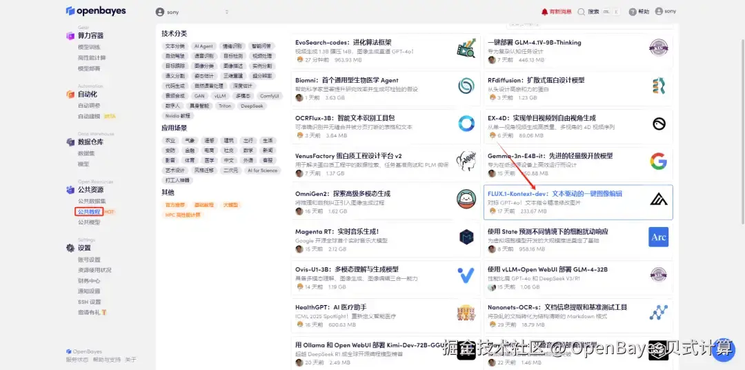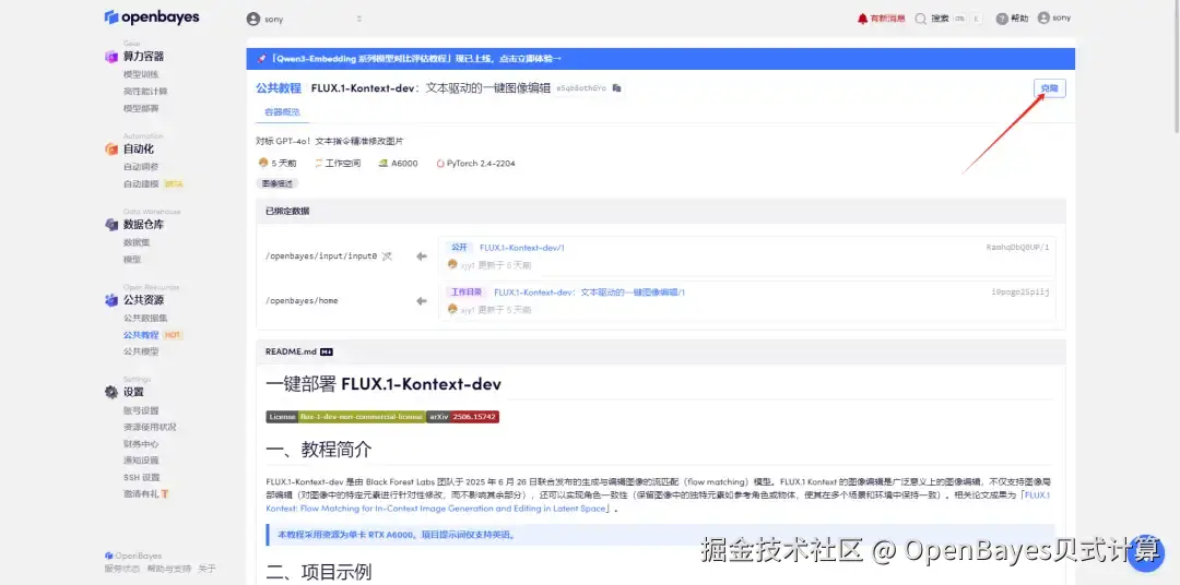 1.登录 OpenBayes,在「公共教程」页面,选择键部署「FLUX.1-Kontext-dev:文本驱动的一键图像编辑」教程。