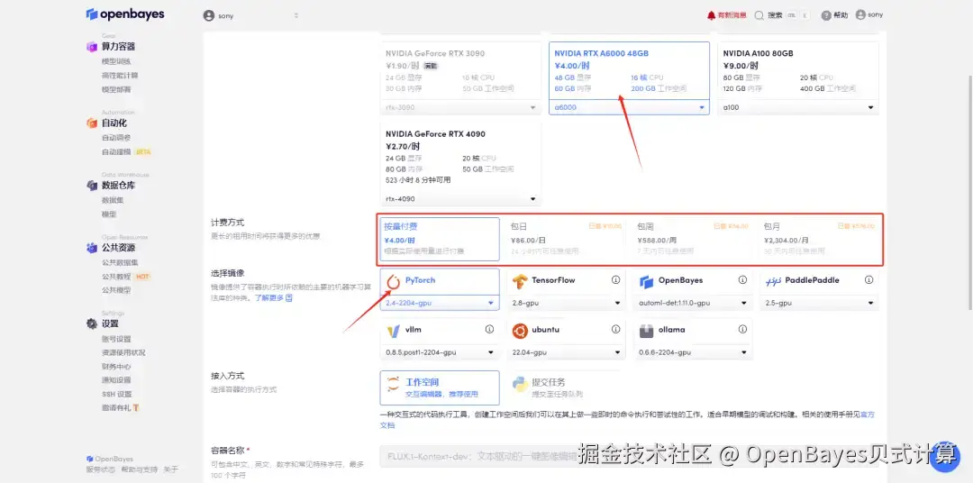 3.选择「NVIDIA RTX A6000」以及「PyTorch」镜像,OpenBayes 平台提供了 4 种计费方式,大家可以按照需求选择「按量付费」或「包日/周/月」,点击「继续执行」。新用户使用下方邀请链接注册,可获得 4 小时 RTX 4090 + 5 小时 CPU 的免费时长!