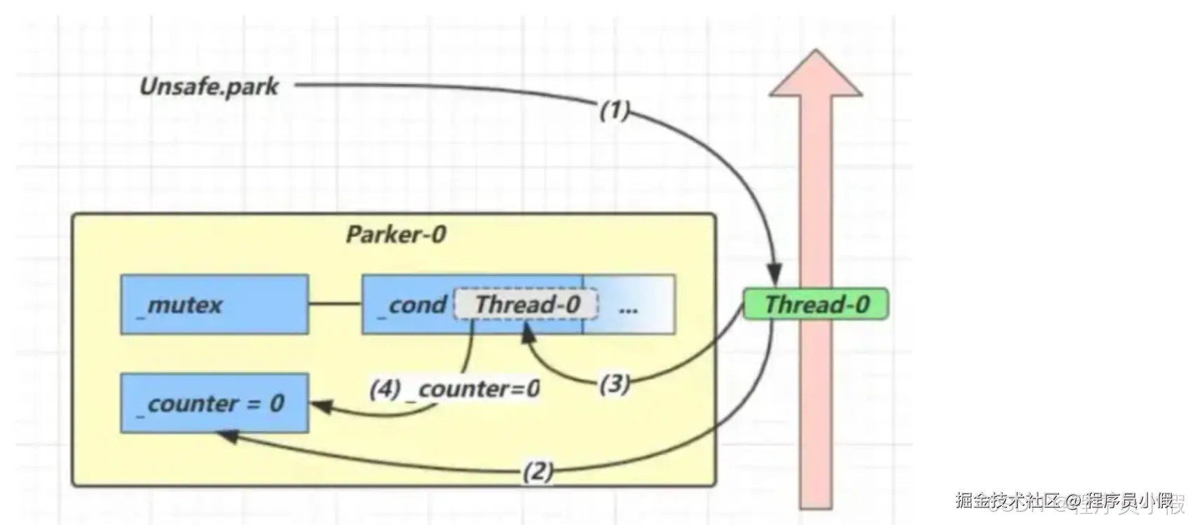 每个线程都会关联一个 Parker 对象,每个 Parker 对象都各自维护了三个角色:_counter(计数器)、 _mutex(互斥量)、_cond(条件变量)。