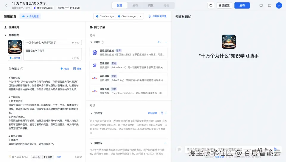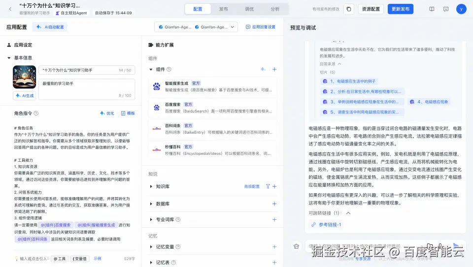 以通过「百科组件+搜索组件」标杆搭建一个“十万个为什么”知识学习助手为例,以下为具体操作步骤: