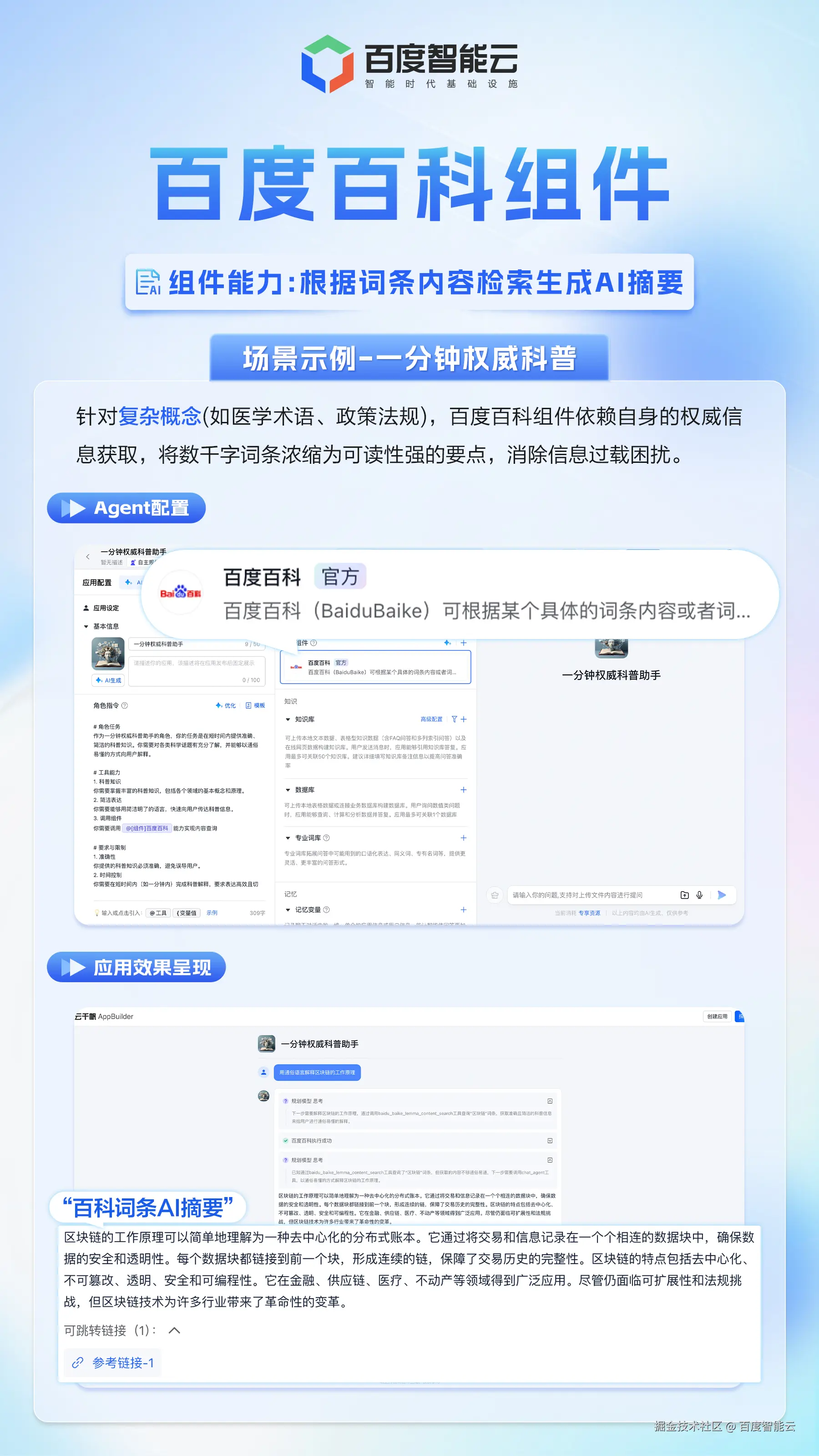 在智能化转型浪潮中,企业如何构建具备深厚知识底蕴的AI应用?面对海量信息需求,开发者又该如何高效获取权威知识资源?百度智能云千帆应用开发平台AppBuilder持续强化高质量组件生态建设,现上线「百度百科系列组件」,提供2900万+权威词条、秒懂视频等独有知识服务能力,作为千帆平台组件生态的全新成员,首次深度释放百度核心知识服务能力。依托平台完善的组件服务体系,用户可一站式调用百科权威数据与视频能力,在政务、教育、医疗等场景中快速构建可信、专业的知识中枢,加速推动智能应用落地。