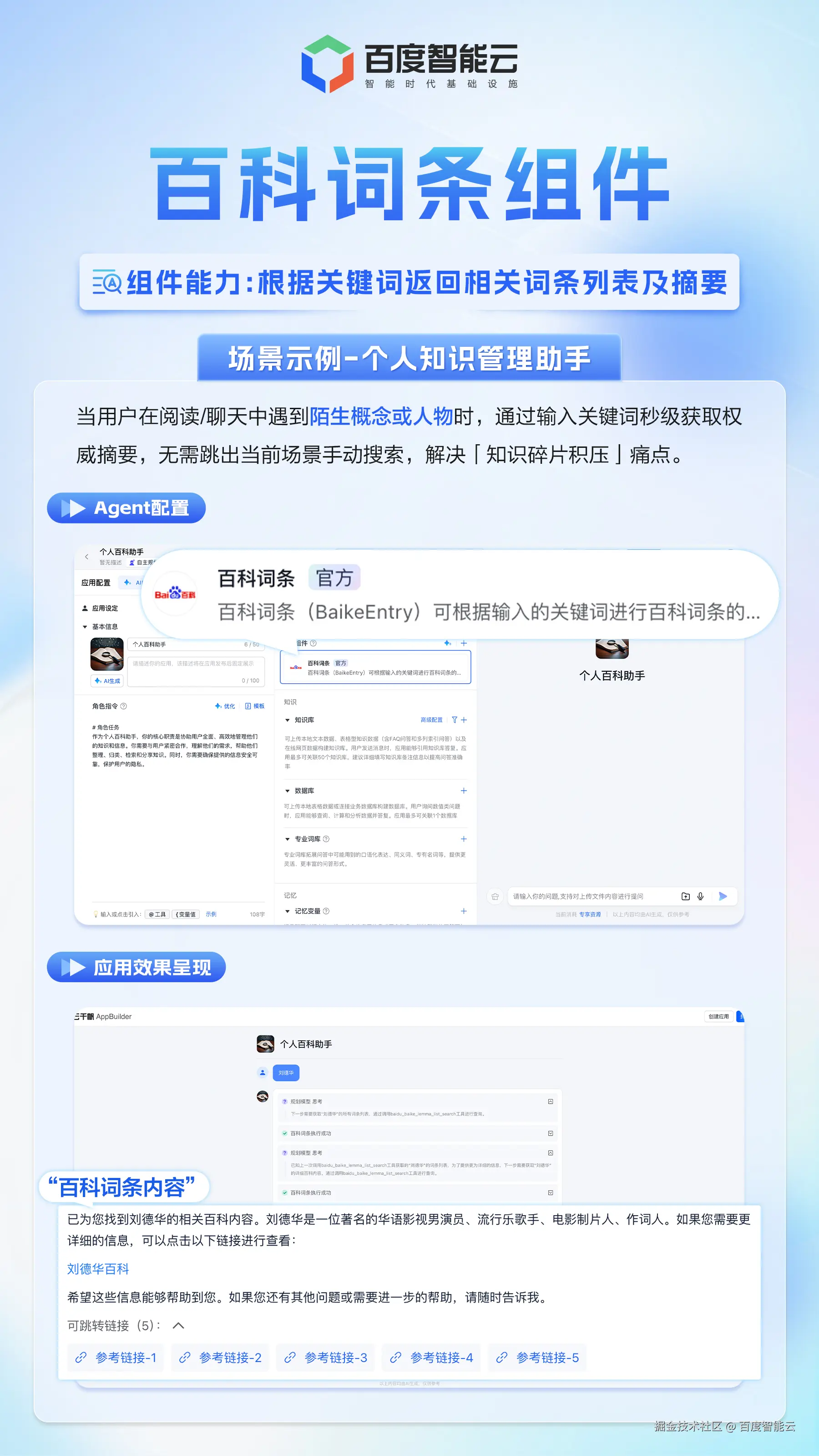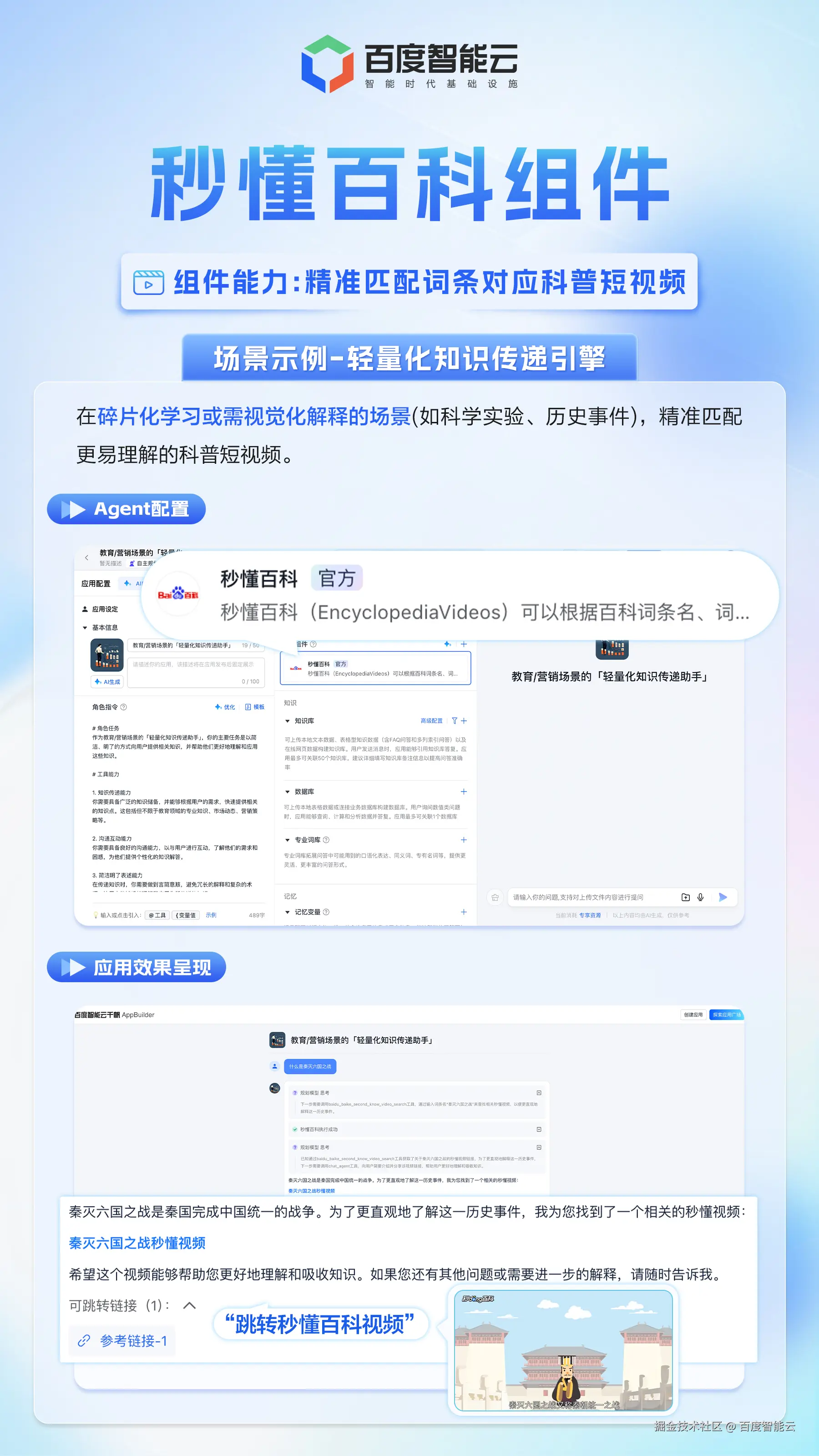 与此同时,百度智能云千帆应用开发平台AppBuilder平台现提供百度百科系列组件每日100次的免费使用额度**,助力开发者们亲身体验如何将**2900万+权威词条与海量秒懂视频,快速、无缝地集成到您的智能应用中,释放知识驱动的无限潜能!