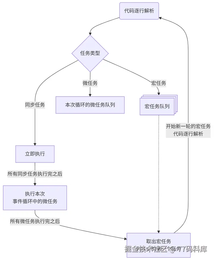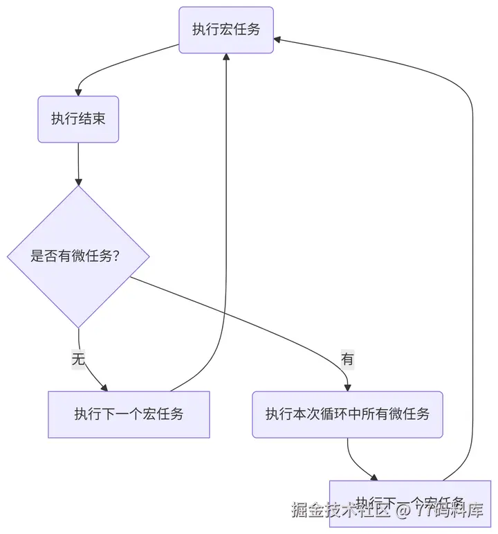 宏任务表示执行时间较长的任务,在每次时间循环时只会执行一个宏任务,执行完毕后处理微任务队列,所有微任务都执行完毕后进入下一个宏任务。