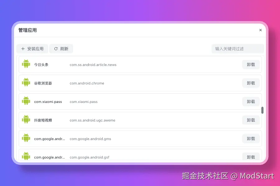支持软件列表查看和搜索,快速安装 APK 软件,常见软件包自动识别名称