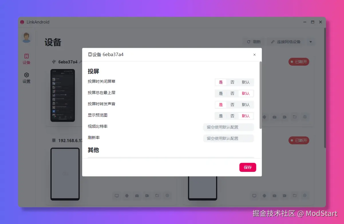 LinkAndroid 是一个全能手机连接助手,方便快捷的连接 Android 和电脑,连接手机后可投屏、 GIF/MP4 录屏、截屏、文件管理、手机操作等功能。