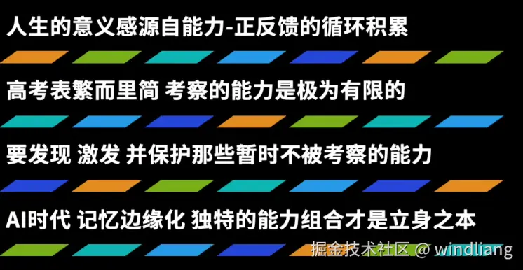 这个很有共鸣,一是前段时间听播客 对话微软中国CTO韦青:不是人类没有未来,是活成机器的人类没有未来 讲过去的教育把所有人都培养成了「机器人」,而现在 AI 时代到来,我们过去所学的技能被轻松替代,那作为人,我们以后该干什么?