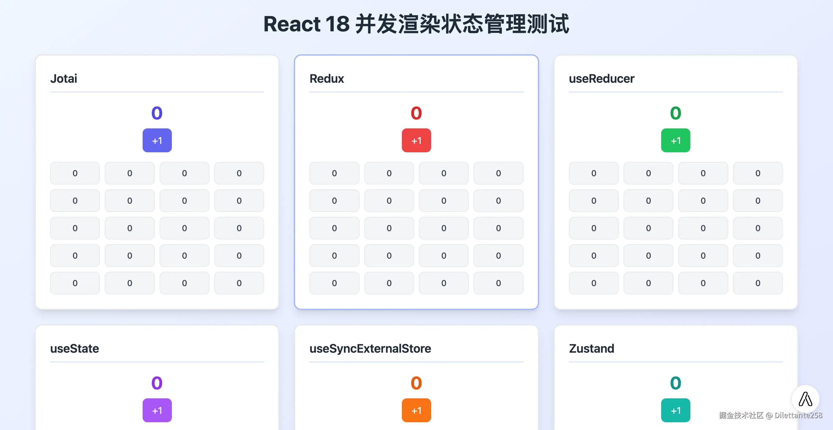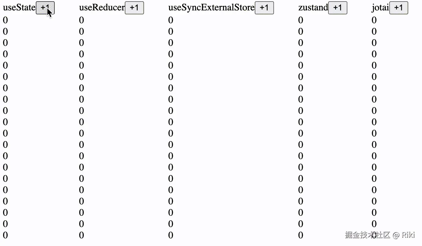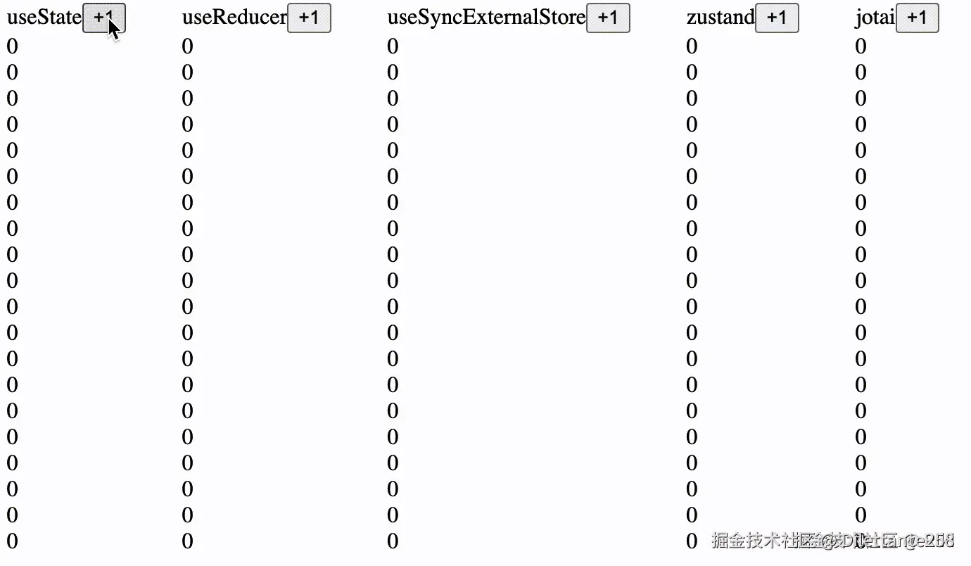 是否卡顿:指在rerender时是否还能相应用户交互,比如上面的useSyncExternalStore或zustand在点击一次后因为rerender再次点击时就会卡住(可以看见按钮一直处于press的状态)