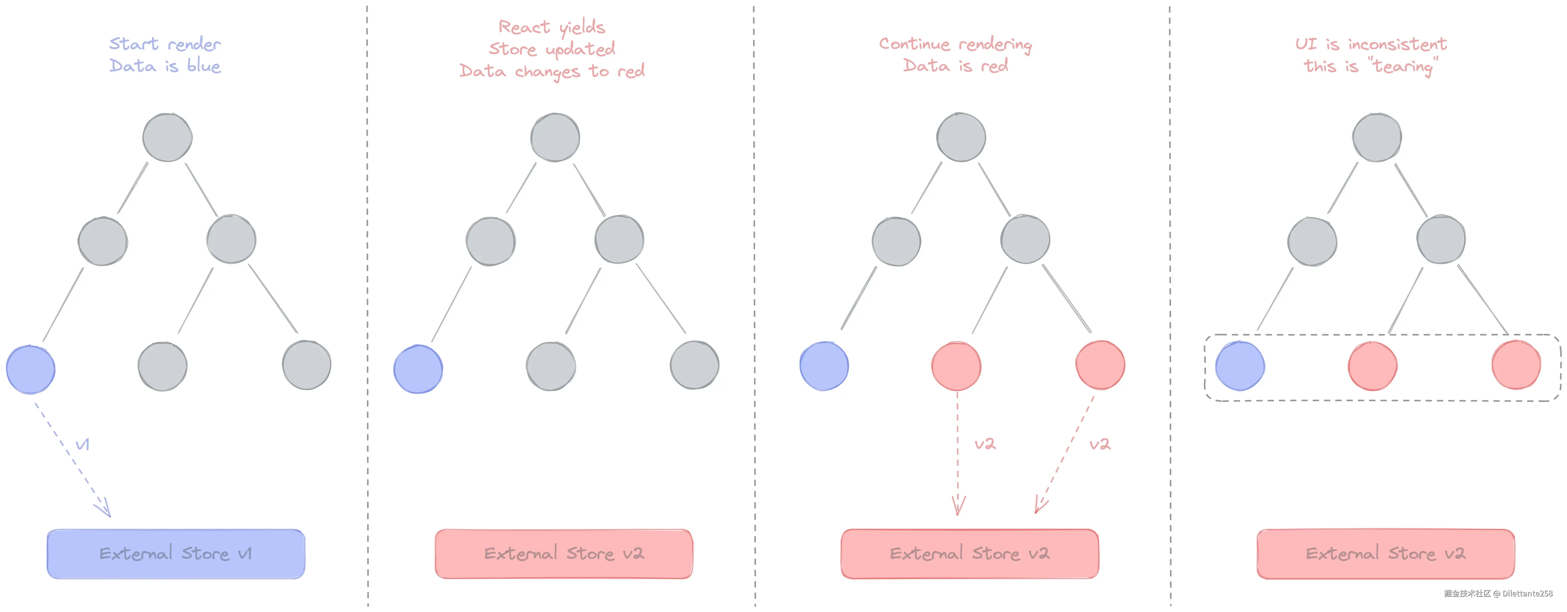如下图所示,假设 External Store (外部 Store)里的一个值发生了变化,然后开始响应式地更新:第一个节点渲染为蓝色(此时 store 的值)。此时发生了一些事情,导致外部 Store 的值又变化为红色,但在此之后渲染的任何组件都会获得当前外部 Store 的值,所以第二个、第三个组件也就渲染为了红色。此时,“Tearing”现象就发生了。