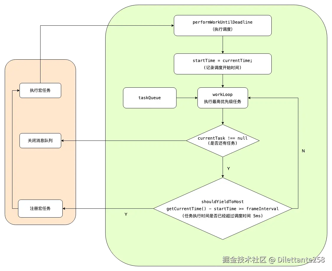 React 的 workloop使用了 MessageChannel 的API: MessageChannel 是以 DOM Event 的形式发送消息,所以它是一个宏任务,会在下一个事件循环的开头执行。所以能够一直使浏览器的事件循环运行React 的 workloop。 这里有一个使用MessageChannel实现 event loop极简的代码 MessageChannel - 掘金 MDN 参考:MessageChannel - Web API | MDN