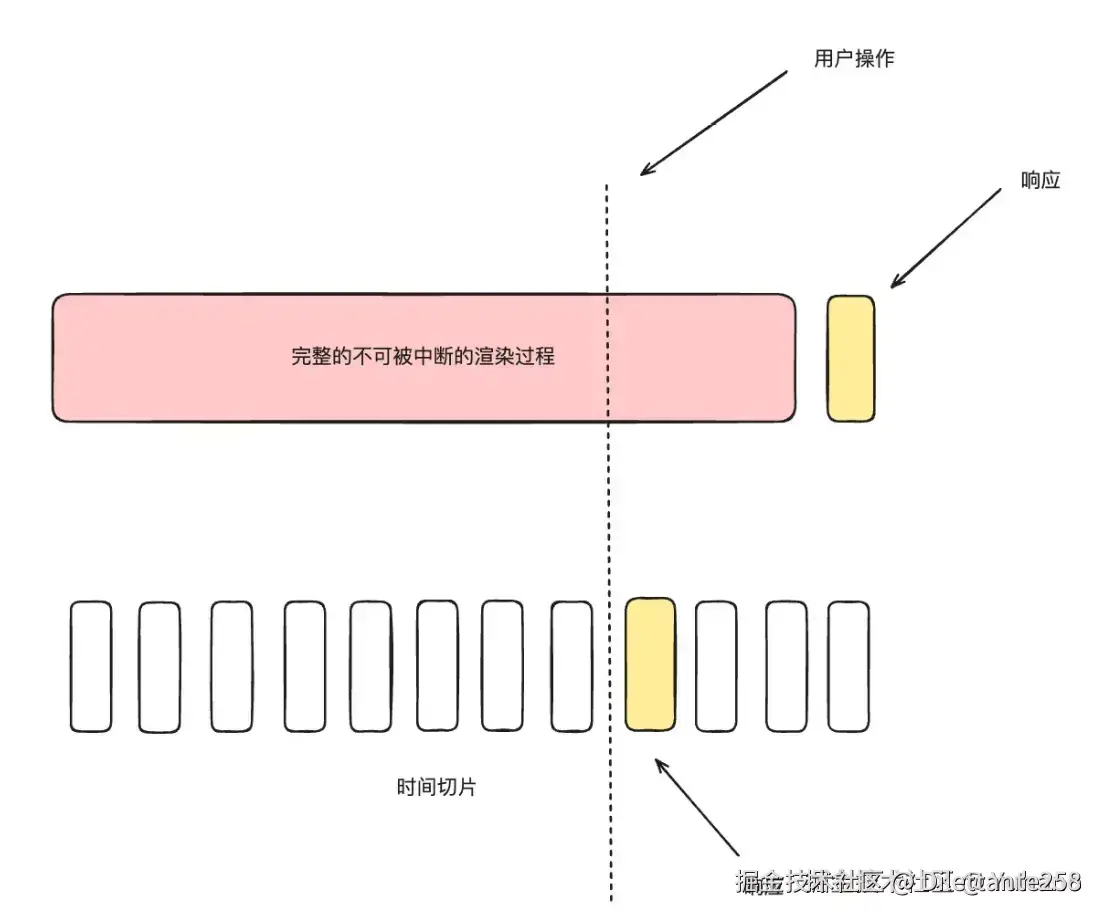 这里有一个简单例子的对比(本文档中的示例一般采用了类似 while (performance.now() - now < 100) 这样的循环代码来模拟了组件卡顿状态),代码:被撕碎的React - 掘金