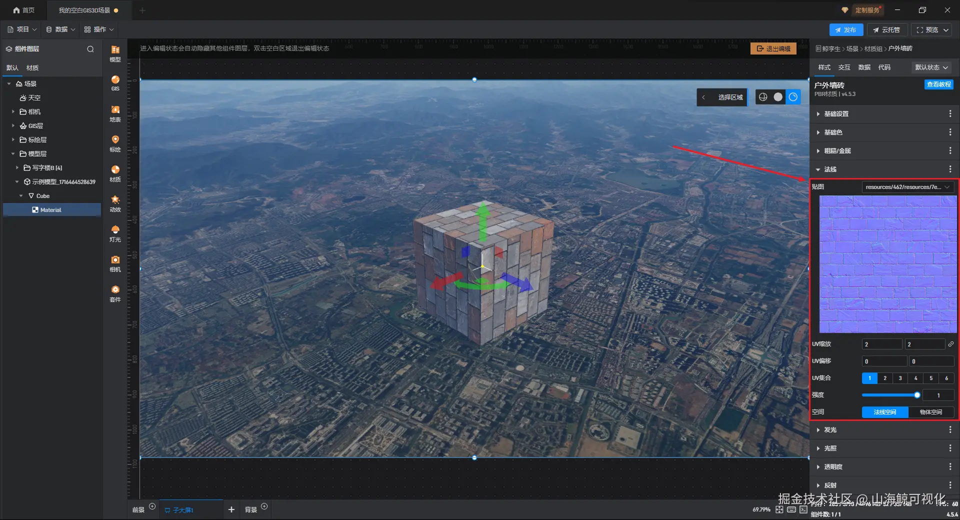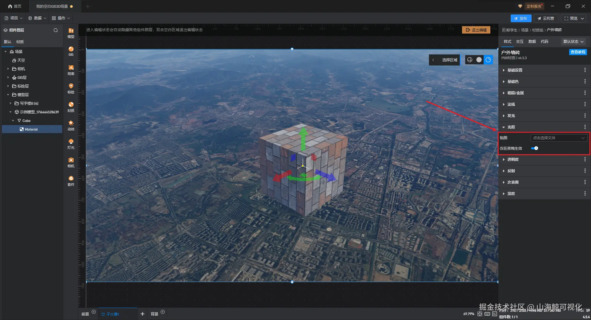 模型的材质决定了三维场景的整体视效,山海鲸可视化不仅支持模型材质的替换与编辑,而且提供了大量现成的模型材质供大家使用,能够帮助大家实现更高效的三维场景搭建。模型材质主要分为PBR材质和水面材质两个部分。其中大部分静态模型都会使用PBR材质,而动态的水面等模型会使用水面材质。下面我们就来看看,如何在山海鲸可视化中设置模型材质。