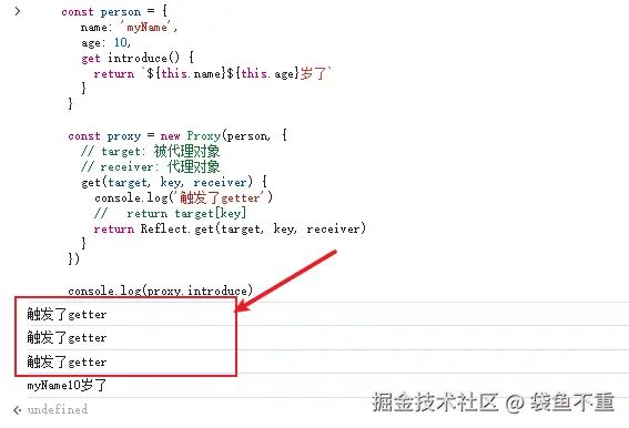 因为我们这里的 this 是 person,而非 proxy,所以 name 和 age 不会再次触发getter。