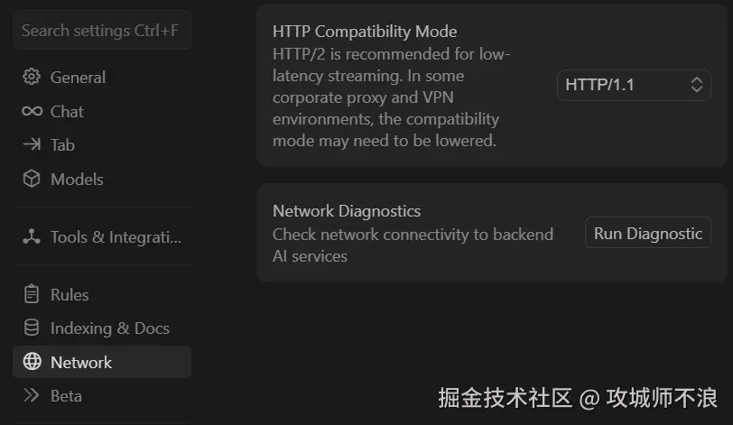 修改Cursor的配置,设置-network(网络)里,将http配置改成http/1.1