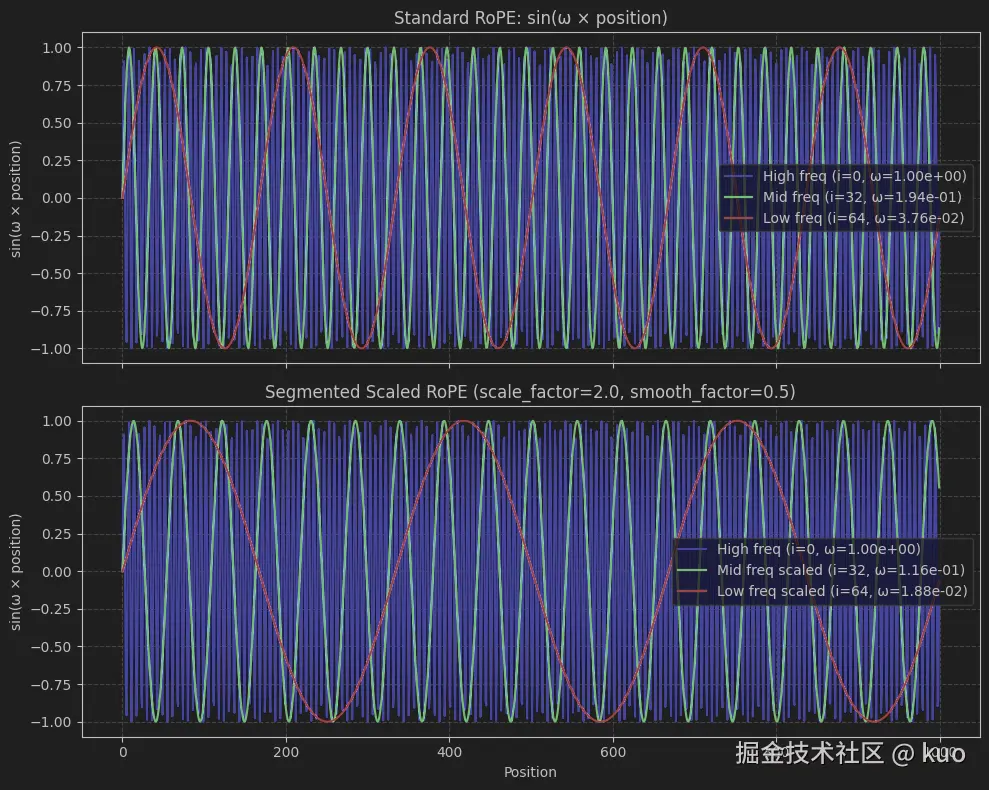 原始RoPE(Rotary Positional Embedding)在上下文长度增加时,高频维度的快速振荡可能导致位置编码精度下降。Scaled RoPE通过调整频率分布(如平滑中频、拉长低频周期),增强位置编码对长上下文的稳健性。