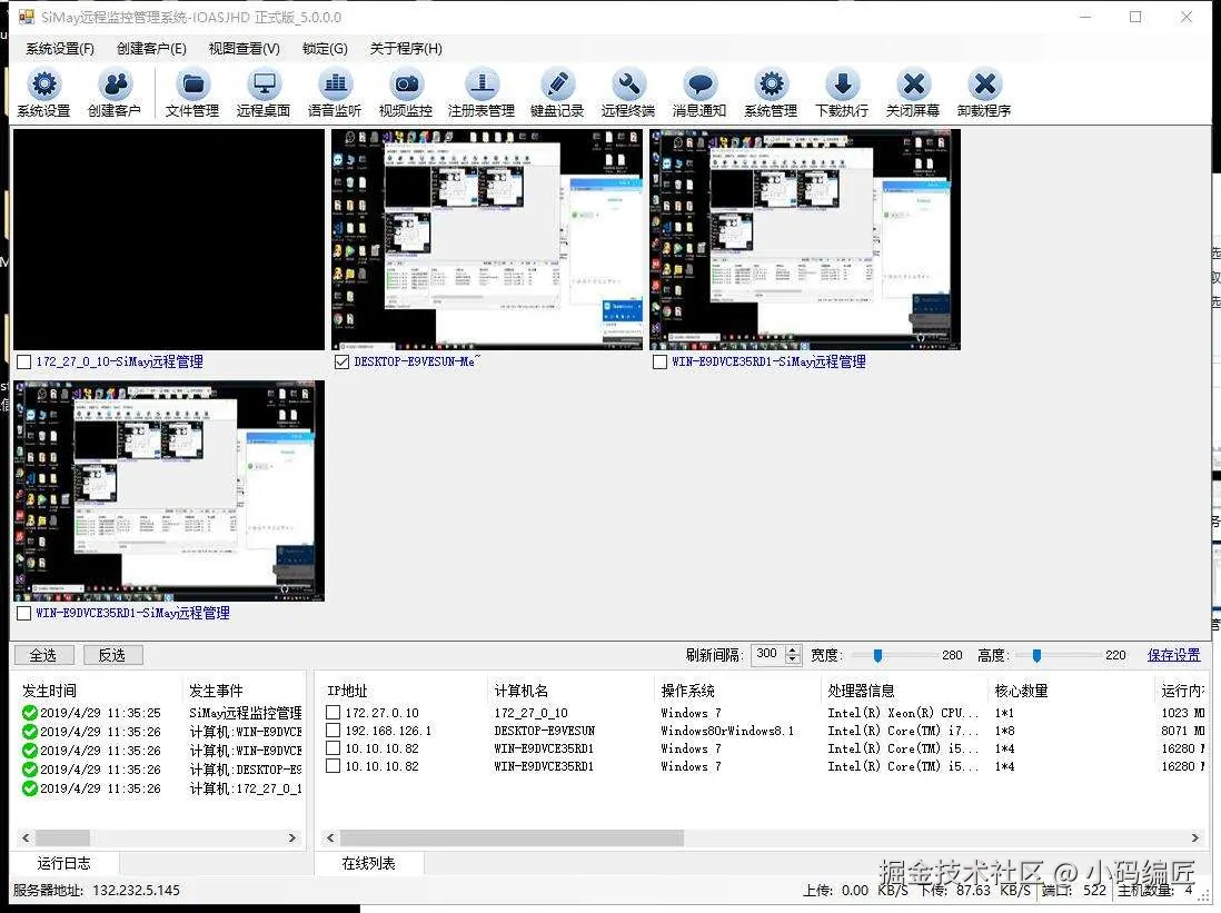 系统采用分层架构设计,底层基于IOCP(Input/Output Completion Port)异步通信模型,支持海量客户端的实时监控与数据传输。
