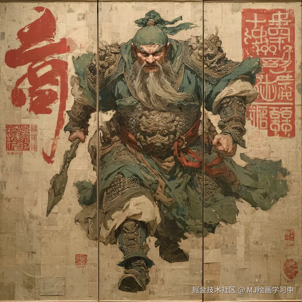 为Midjourney设计的东汉末年关羽全身像中文提示词,聚焦历史真实性、武将威仪与标志性元素,融合艺术表现力: