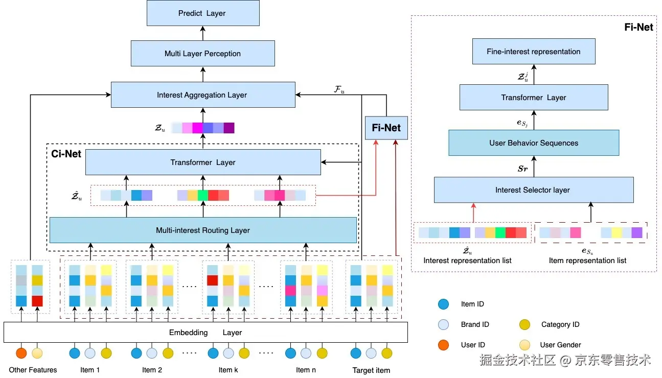 在工业界,点击率(CTR)预测的最先进方法主要依赖于基于 Transformer 的网络及其变体。然而,随着用户行为序列变长,在受限的推理时间内采用自注意力网络进行 CTR 预测面临重大挑战。为解决这一问题,主流方法采用经典的两阶段范式:通用搜索单元(GSU)用于从长期行为中快速检索相关物品,精确搜索单元(ESU)用于对 GSU 筛选出的物品应用有效的多头目标注意力(MHTA)。这些两阶段算法存在一定局限性:首先,GSU 需要为不同的目标物品检索不同的目标子序列,这使得 ESU 只能采用次优的 MHTA 网络,而非更有效的基于 Transformer 的网络;其次,GSU 仅从用户行为序列中检索部分物品,忽略了用户兴趣的演变以及不同兴趣点之间的关联。为此,本文提出一种端到端层次化用户长期行为建模网络用于 CTR 预测(HBM)。具体而言,首先采用多兴趣路由层将用户的长期行为分流到多个聚合的兴趣簇中;此外,引入精细兴趣学习网络,从初始聚合表示中筛选出 top-k 个兴趣;随后,利用 Transformer 网络对与这些 top-k 兴趣相关的用户行为序列进行精细化建模,同时在粗粒度层面捕捉不同用户兴趣之间的内在关联。在京东推荐平台的在线 A/B 有很大的提升。
