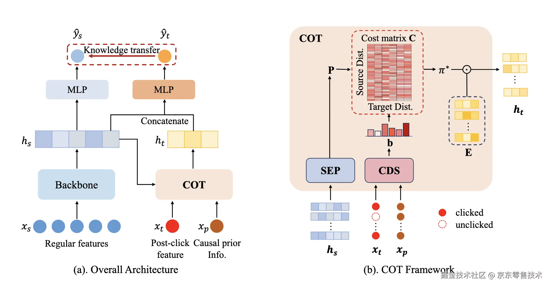 精准的点击率(CTR)预测对在线广告至关重要,其依赖于浏览历史、用户画像等常规特征,以及广告位、页面行为等post-event特征。然而,post-event特征在推断阶段不可得,常面临训练-推断不一致性和低覆盖率问题,尤其是停留时间等仅存在于被点击item的点击后特征。为解决这些挑战,我们提出因果最优传输框架(Causal Optimal Transport, COT),其创新性体现在:(1) 通过半监督伪标注生成点击后伪特征;(2) 利用因果分布调整器(Causal Distribution Shaper, CDS)实现精准的因果特征分布生成;(3) 通过最优传输优化特征分布,最小化分布差异以促进知识迁移。基于真实数据的实验验证了COT在通过改进用户兴趣建模和偏差缓解来提升CTR预测方面的优越性。理论分析证明了该框架的鲁棒性。
