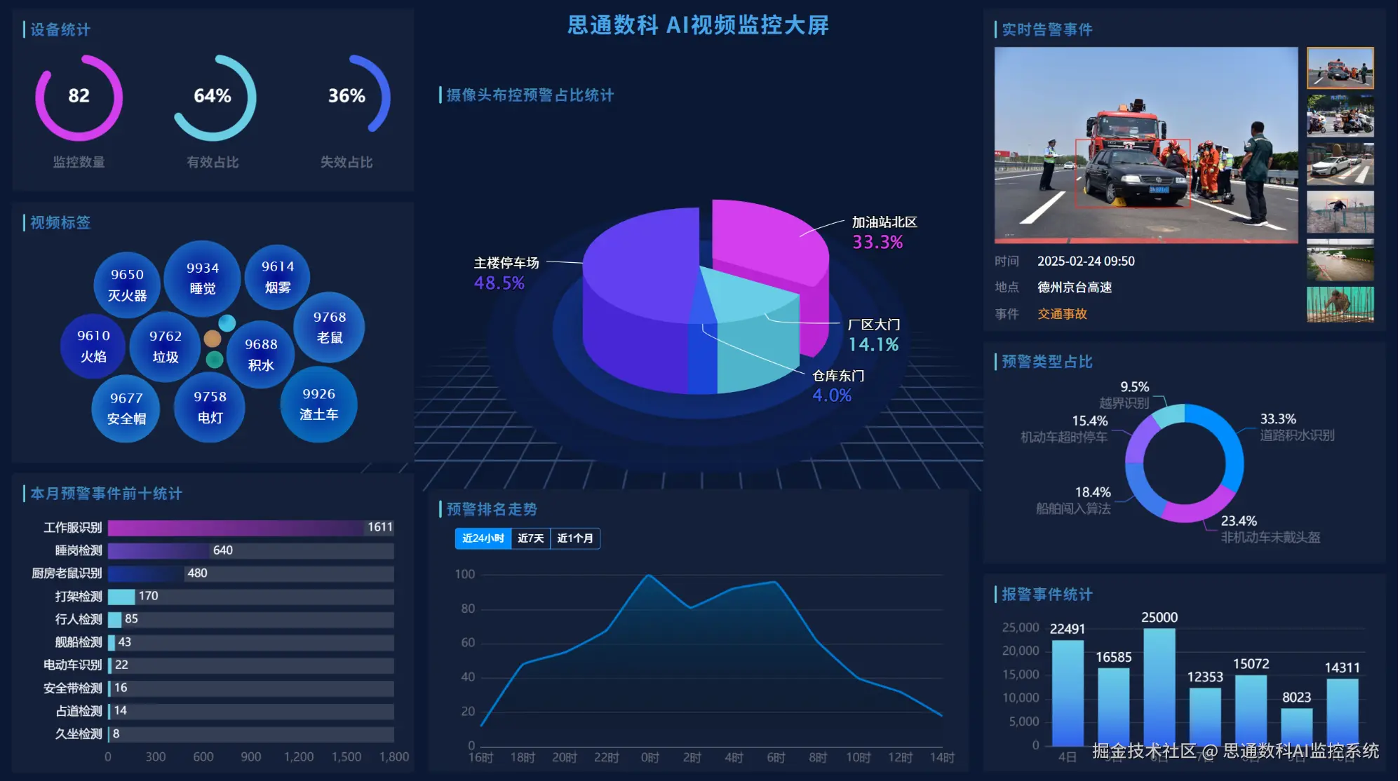 多维报表:自动生成事件类型统计、处置效率分析、高发点位热力图等报表,安全隐患一目了然。