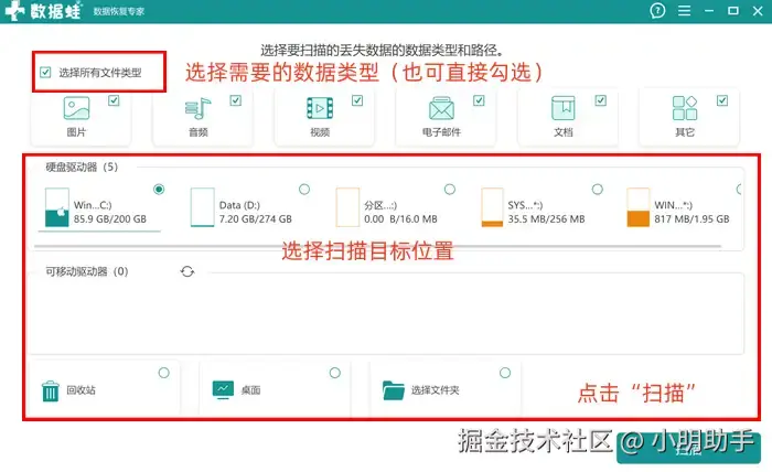 步骤1: 在软件的首页中,我们可以在首页中选择需要找回文件的类型,再选择需要进行扫描的磁盘,最后才开启软件进行扫描;
