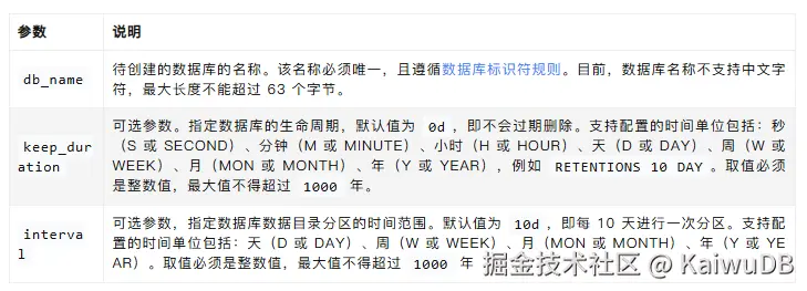 在此我们刚好验证到了:创建数据库时,如果指定 retentions 和 partition interval 参数的取值,则显示指定的取值。如未指定,则显示该参数的默认值。默认情况下,retentions 参数的取值为 0s,partition interval 参数的取值为 10d。