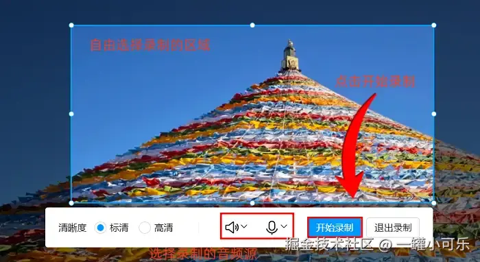 步骤2:进入视频录制界面后,可以手动划定录制的屏幕范围。与此同时,对声音相关参数进行配置,例如决定是否开启麦克风收音、是否同步录制系统发出的声音等。另外,在 “快捷键设置” 模块中,用户能自定义录屏相关的快捷键。如果使用默认设置,按下 “Alt+S” 组合键就可以启动录制了。