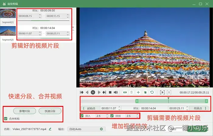 步骤3:录制结束之后,软件会自动弹出录制视频的预览窗口。此时可以借助软件内置的编辑工具 “高级剪辑” ,对视频进行剪辑、添加转场效果等后期处理。