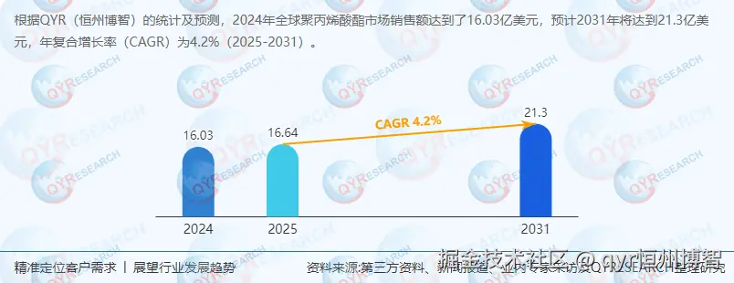 根据QYResearch最新调研报告显示,2024年全球聚丙烯酸酯市场销售额达16.03亿美元,预计2031年将增至21.3亿美元,2025-2031年CAGR为4.2%。增长驱动因素包括: