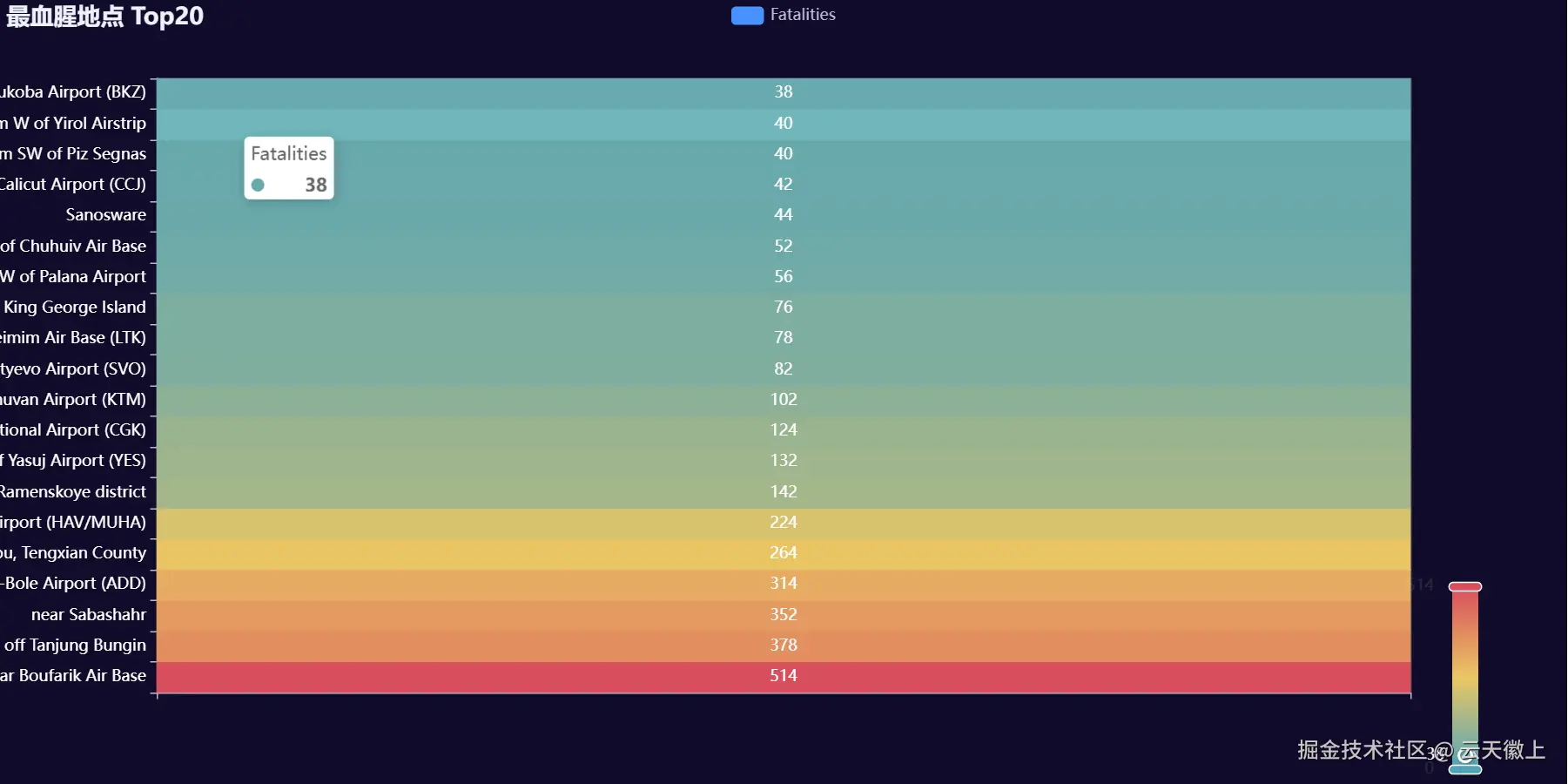 通过以上分析,我们从多个角度对航空事故数据进行了可视化展示。从时间趋势到机型、运营商、地点等多个维度,我们能够更全面地了解航空事故的特征。这些图表不仅具有视觉冲击力,还能帮助我们快速提取关键信息,为航空安全研究提供有力支持。