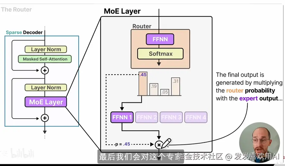 Decoder-Only架构由多个Decoder Block堆叠而成。每个 Decoder Block 通常包含两层 LayerNorm,分别用于Masked Self-Attention 和 FFNN 的输入,外加对应的残差连接。Masked Self-Attention 用于建模序列的前向依赖,FFNN 则由两层全连接层和中间的激活函数组成。而 MoE 架构之所以能在扩增模型参数量的同时节省算力其实就是在 FFNN 部分做的文章。