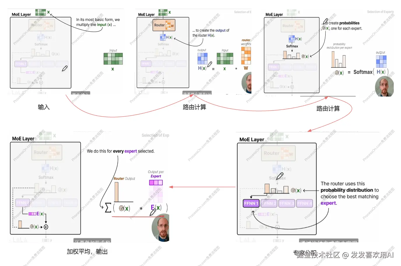 上面我们逐一过了MoE架构中的各个组成部分与重要设计,现在让我们整体的来梳理一遍 MoE 层的整个计算过程。