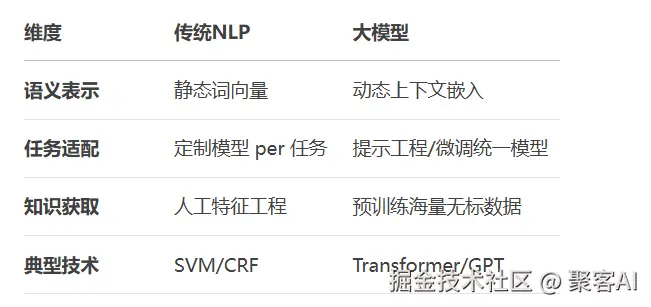 示例:传统NER需训练独立模型,而大模型通过Few-Shot提示即可实现: “文本:马云曾任阿里巴巴CEO。抽取实体:__” → 模型输出:{"人物": "马云", "公司": "阿里巴巴"}