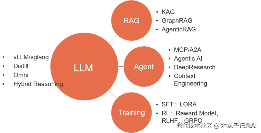 本文以容易理解的信息化视角,结合实际项目经验,梳理一套AI应用层面的基础技术体系,按投入成本和落地难度从小到大分别是:LLM基础对话<RAG<Agent<Training,同时将近期出现的一些新技术和新方向都归纳到这个体系层次中去,助力读者建立起对AI的核心认知框架。