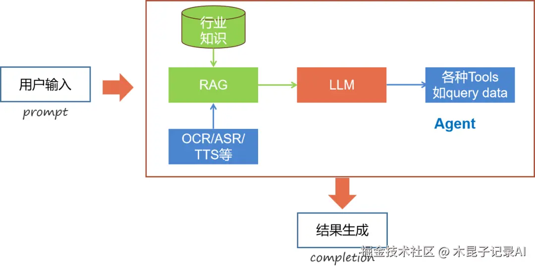 在以上RAG的基础上,如果你还需要进一步调用工具,比如要调用工具查询数据库,比如要调用查询天气、订票的工具等,比如在知识库检索之前,需要先进行OCR识别,或者先基于ASR进行语音识别,得到文本再进行检索,比如在大模型和工具调用之后,需要将文字转成语音输出,利用TTS进行转换等。