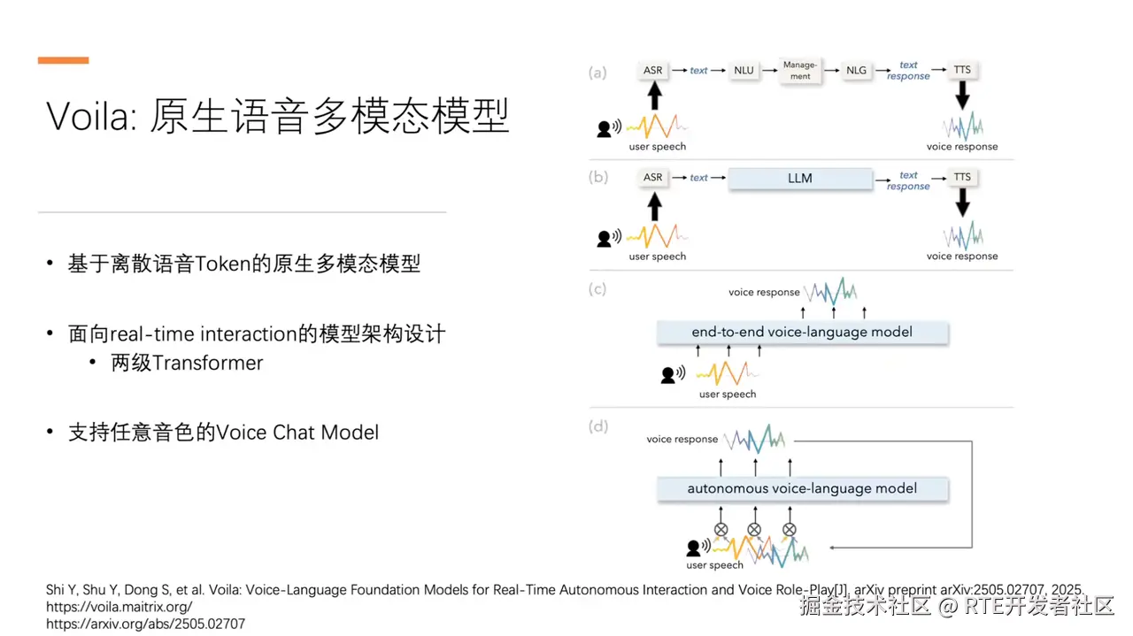 我们采用端到端的双流结构,以便未来扩展到多人场景,并融入视频模块。虽然多流结构在效果调优上更具挑战,但相比外挂式模型,端到端模型的优势在于延迟更低,最低可达 40-80 毫秒,相当于一到两个 Token 的时间。