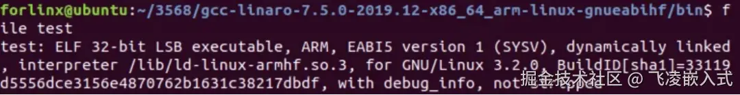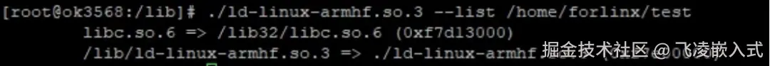 ③ 如果需要手动指定库的位置,可以使用以下命令: /lib/ld-linux-armhf.so.3 --library-path /lib32 --list /home/forlinx/test