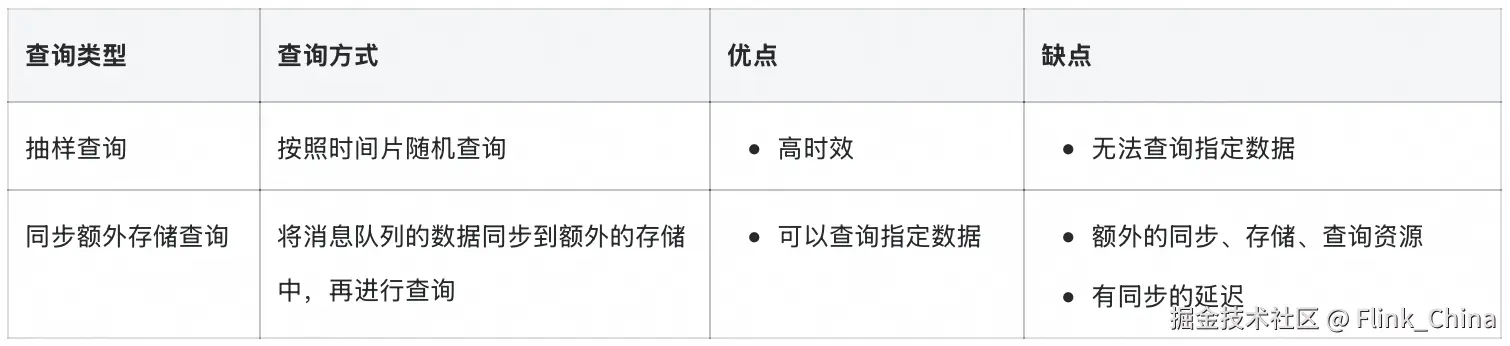无论是排查问题还是进行数据探索,都需要进行数据查询。但消息队列仅支持在界面中抽样查询和在额外存储中查询同步的数据。在抽样查询中,无法查询指定数据,只能拉一批输出展示查看,以同步额外存储这种方式,又会带来分钟级的延迟和额外的存储、计算成本。