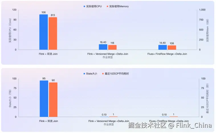 经过实测,从双流 Join 迁移到 Merge + Delta Join 后,成功减免了 95TB 的大状态,使得作业运行更加稳定,CP 时间也大幅缩短。同时 CPU 、Memory 实际使用也降低了 80%+。
