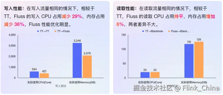 我们对 Fluss 的读写、列裁剪能力进行了测试。其中,在读写性能上,我们通过相同的流量进行测试,在保持输入 RPS 为 800 w/s,输出 RPS 44 w/s 的情况下,通过对比 Flink 任务实际使用的 CPU、Memory 进行比对。具体如下