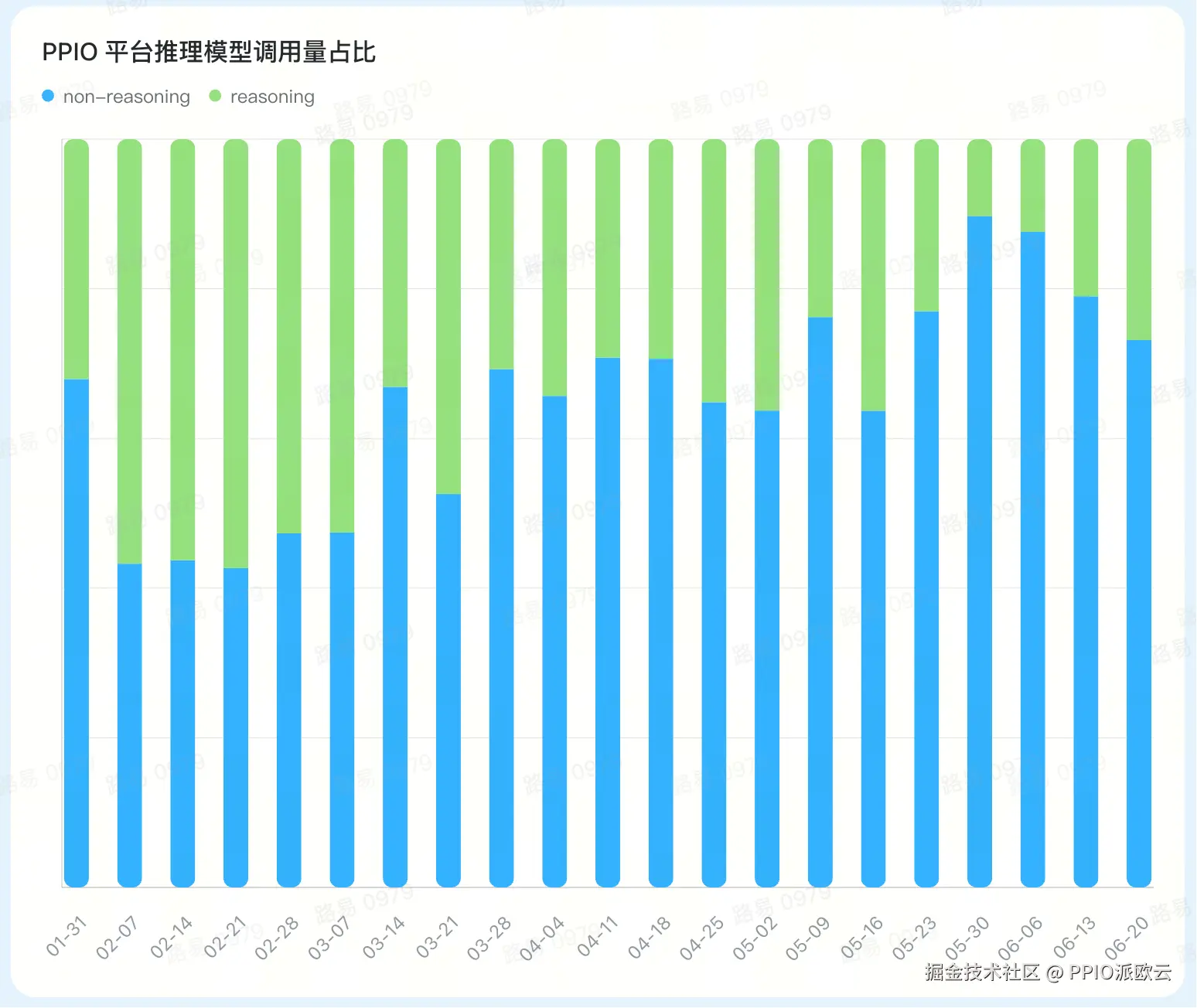 2025 年 2 月份,推理模型受到广大 AI 开发者的青睐,其全平台的使用量占比保持在 50% 以上。但从 3 月份开始,非推理模型的使用量反超推理模型,并一直延续至今。