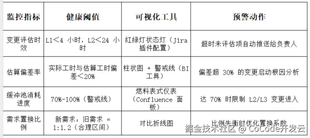 我们需要重点监控变更对估算的影响,主要是重点跟踪四个指标:变更评估时效、估算偏差率、缓冲池消耗进度、需求置换比例,通过 “阈值预警” 来进行及时干预: