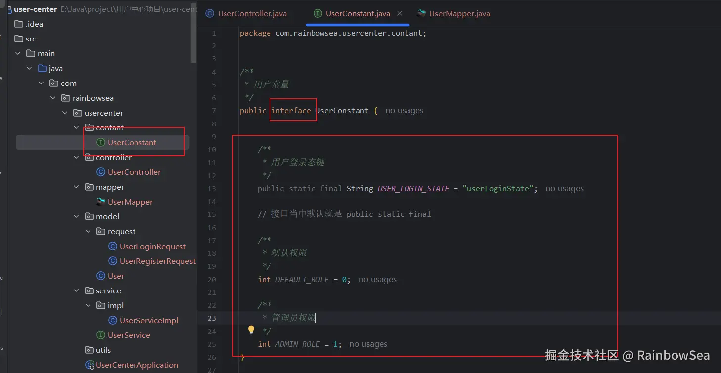 - 优化将用户常量都封装到一个包当中,定义到为常量类,这里我们是一个接口,常量