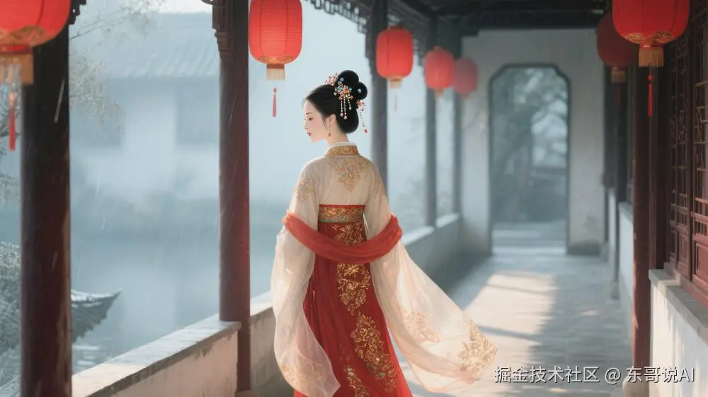 | 提示词 | 古风美人,汉服 | 绝美古风仕女,身着精致华贵的汉服,宽袍大袖飘逸婉转,衣袂飘飘如行云流水,繁复的金线刺绣在轻薄的丝绸上闪烁微光。古典鹅蛋脸,柳叶弯眉,樱桃小口,明眸皓齿,眼神温柔似水。发髻高挽,点缀珠翠步摇,在阳光下熠熠生辉。背景是烟雨朦胧的江南庭院,雕栏画栋间飘落着粉白梨花,远处可见小桥流水。采用工笔重彩技法,细腻温婉的笔触,柔和温暖的光影,淡雅的水墨色调中点缀着朱红、靛青等传统色彩,整体呈现出典雅含蓄的东方美学意境 |