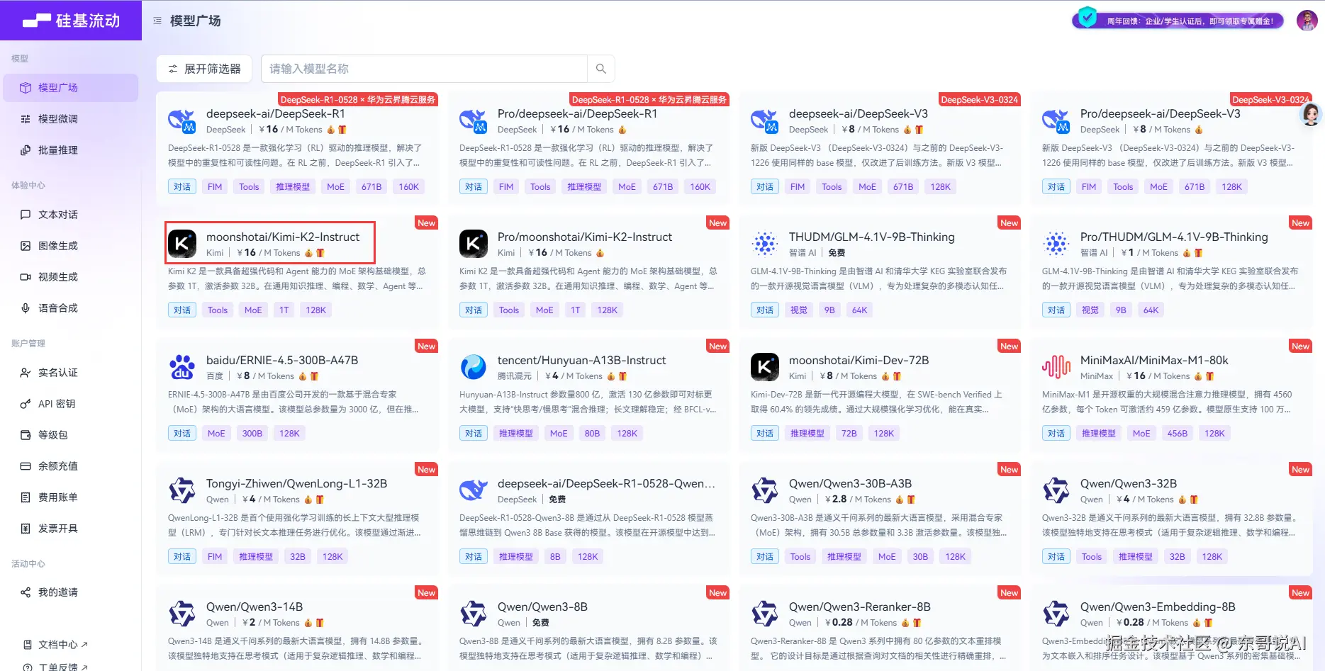 这样就可以免费调用各种国内大模型,包括文本模型、图像模型和多模态模型等,还有最近火起来的K2模型也能免费用很久了:
