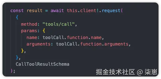 执行调用的时候,依旧使用client处理,调用tools/call,让服务执行,返回执行结果。