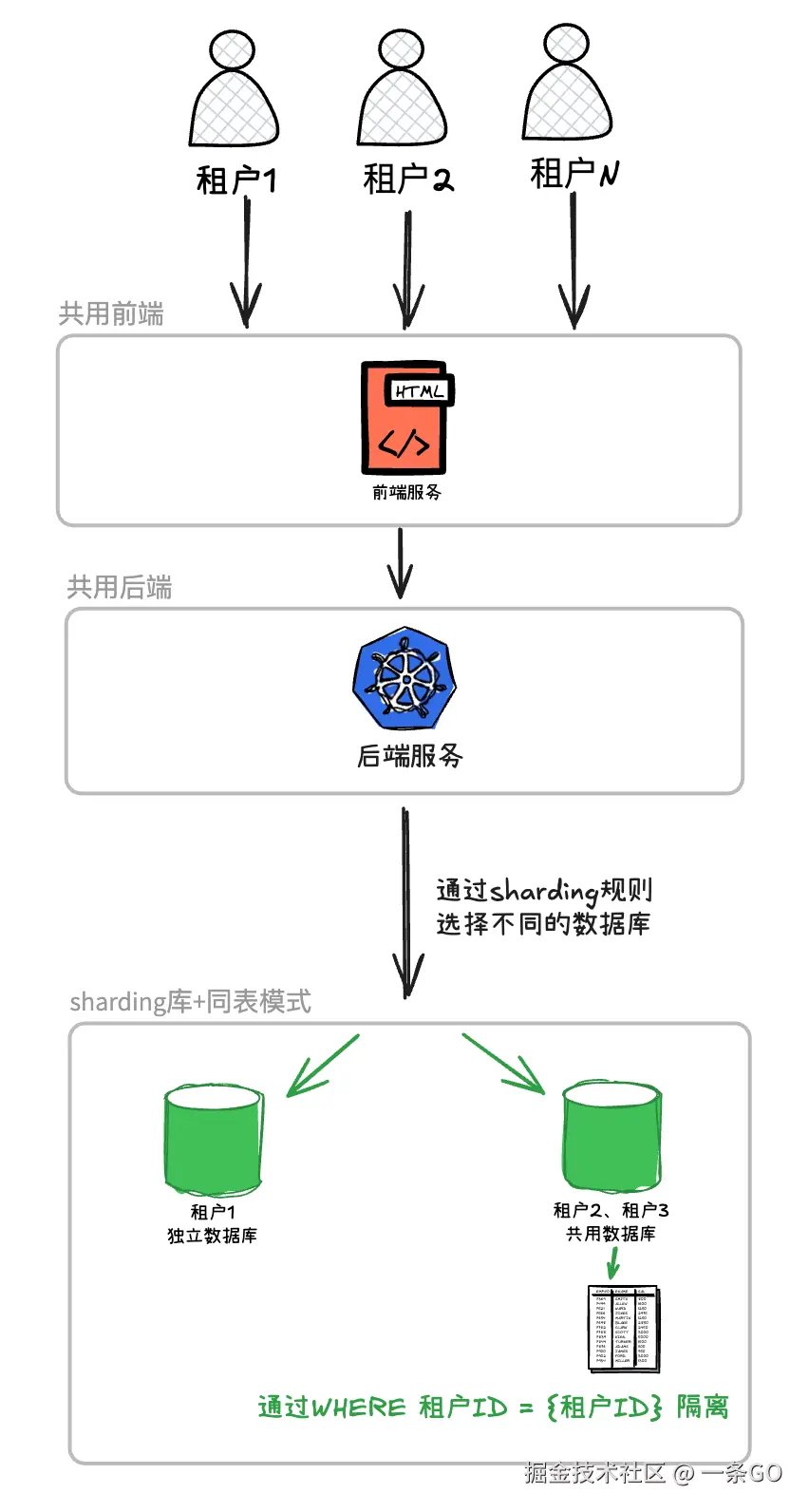 - sharding的是租户是共用:清洗自己的数据形成一个新库,创建新服务层,配置好流量转发即可