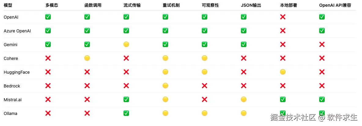 我一听这不就是Spring AI 聊天模型兼容性和功能支持的问题嘛!今天这篇文章,我就用讲故事的方式,跟大家聊聊我踩过的那些坑、试过的那些模型,从以下几个维度横向对比一下目前 Spring AI 支持的主要聊天模型: