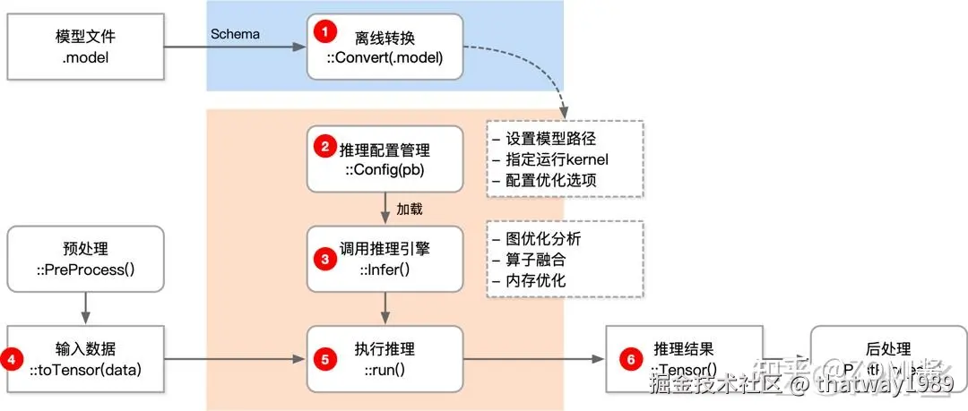 开发工程师会按照这个流程进行工作,开发完成后,推理引擎将执行推理任务,使其在运行时(Runtime)中运行。此时,推理引擎的执行依赖于输入和输出的结果,这涉及到在线执行的部分。