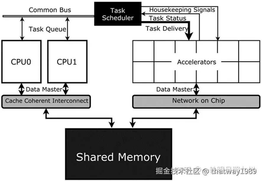如上图是AI芯片中A核负责任务分发,Accelerators也就是NPU负责任务执行,其拥有大量异构加速器的软硬件系统。由于加速器可能需要使用CPU生产的数据,因此内存的coherence和consistence的设计十分具有挑战。并且操作系统的堆栈、编译器以及调度器都需要重新设计,特别是为了进行并行计算,所以要在A核和NPU直接需要加一些执行并行的软硬件:调度器。